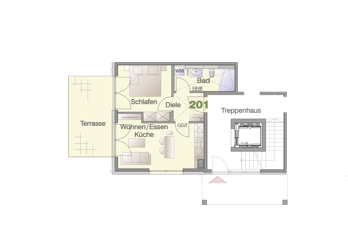 | 201 | Erdgeschoss | 46,17 m² | 2- Zimmer | Verkauft | Verkauft |
